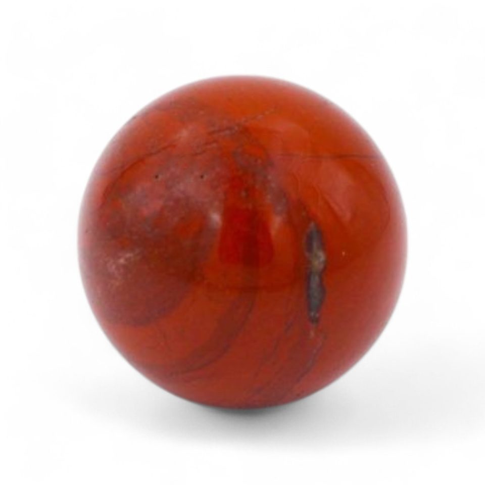 A polished red jasper sphere known for grounding energy, strength, and emotional stability