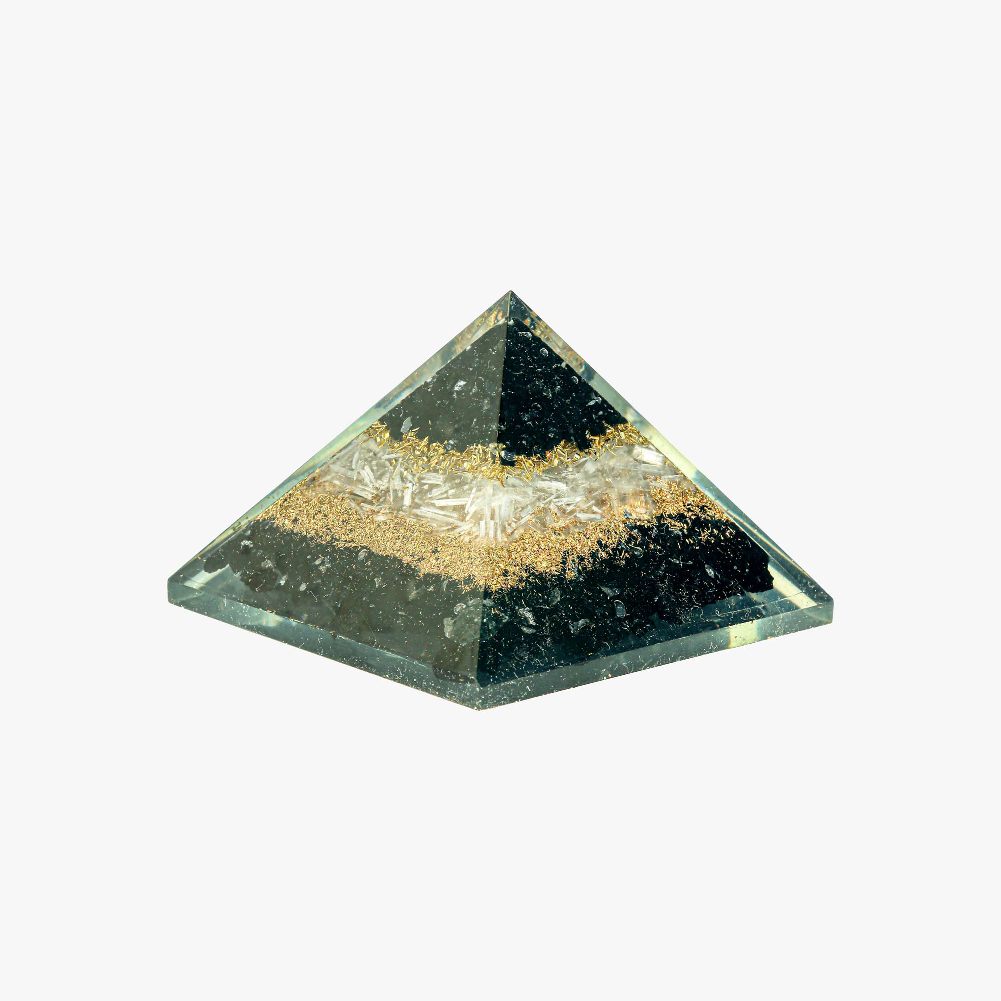 Formed as a blend of complex borosilicate mineral (Black Tourmaline) with delicate selenite, this orgone pyramid carries a natural character that enhances its soothing presence. Its approximately 75mm size gives it a balanced presence without occupying much space, making it perfect for desks, meditation corners or bedside tables. Many people appreciate how each pyramid features carefully selected stones and subtle variations in pattern, giving every natural Black Tourmaline crystals pyramid its own unique charm. People often explore other crystal orgone pyramids to complement their spiritual décor or gifting needs.