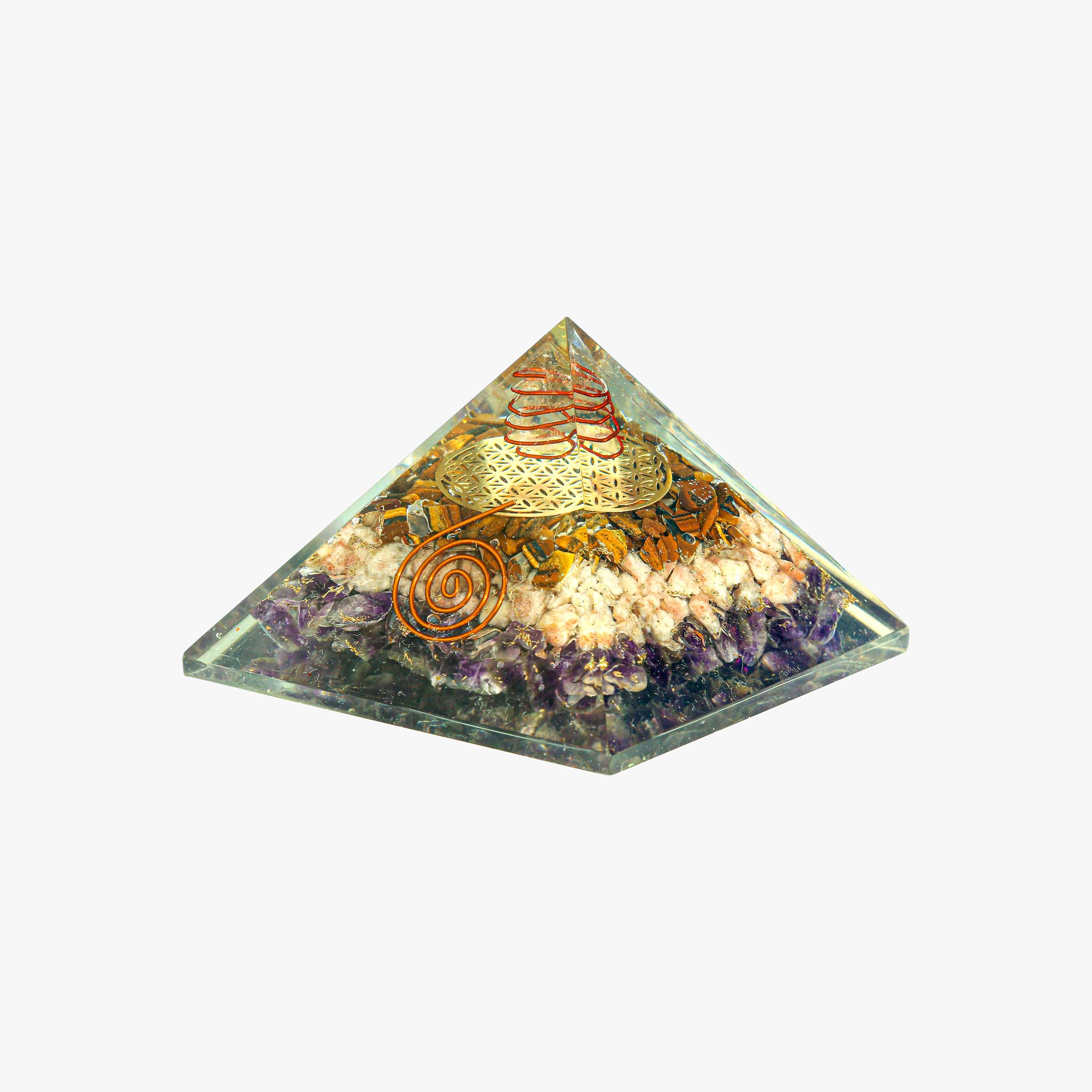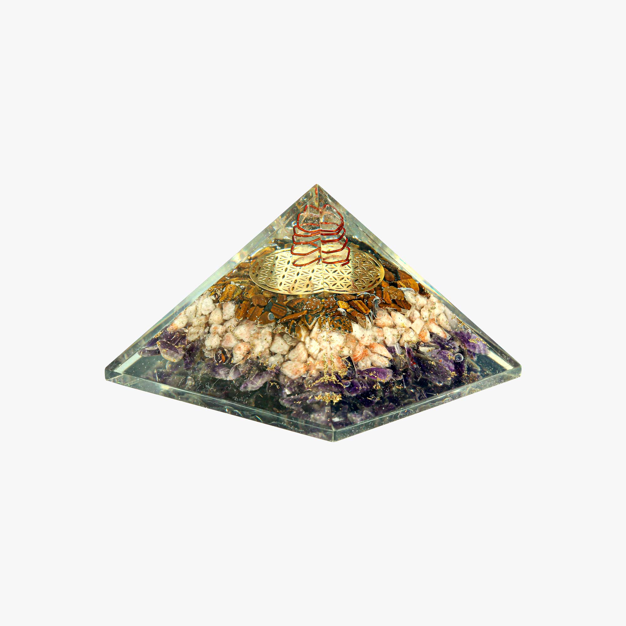 Combining the vibrant energies of tiger eye, sunstone and amethyst, this orgone pyramid is often chosen by those who wish to create a calm yet empowered atmosphere at home or work. Many believe tiger eye brings courage and decision strength, while sunstone inspires positivity and success. Amethyst is thought to support intuition and spiritual clarity, weaving a serene presence into any space. People in India often place this pyramid for gentle chakra alignment, connecting with the Solar Plexus, Root, Third Eye and Crown Chakras for a sense of both grounding and upliftment.