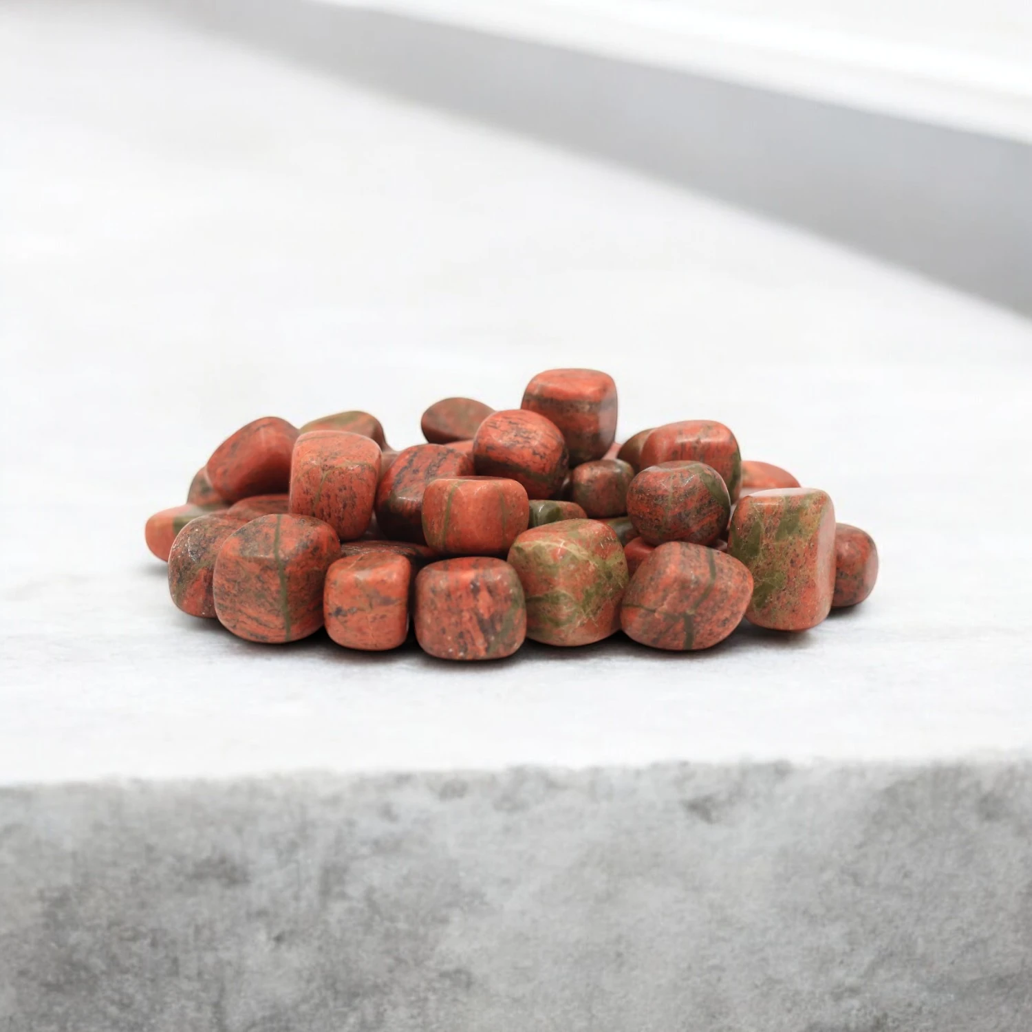 Unakite tumbled stone is cherished for its soft, nurturing energy that many believe supports emotional balance, gentle healing, and steady growth. Each 25mm tumble sits comfortably in the palm or a crystal bowl, making it easy to carry or display in personal spaces. People in India often keep Unakite stones near their bedside, money corner, or meditation setup to cultivate a sense of harmony and renewal. This stone is known for gently bringing emotions into balance and encouraging personal growth at a pace that feels natural and comforting. Many link Unakite with the Heart Chakra, where it is thought to help open the heart to healing and peaceful energy. It is also often connected with Scorpio (Vrischik Rashi) for those seeking transformation and inner strength.